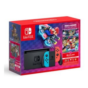 Compite a través del mundo de Mario y sus amigos. Este paquete incluye todo lo que necesitas para comenzar tus aventuras de Super Mario, incluyendo una consola Nintendo Switch con controles Joy-Con rojo neón y azul neón.