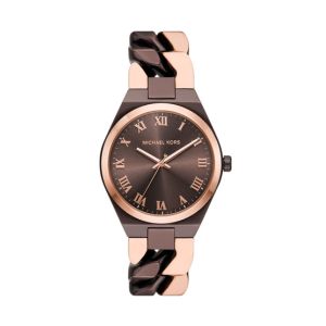 El reloj Lennox de 37 mm de Michael Kors tiene una esfera en tono chocolate con efecto «rayos de sol», movimiento de tres agujas y brazalete de acero inoxidable en tono chocolate y oro rosa.